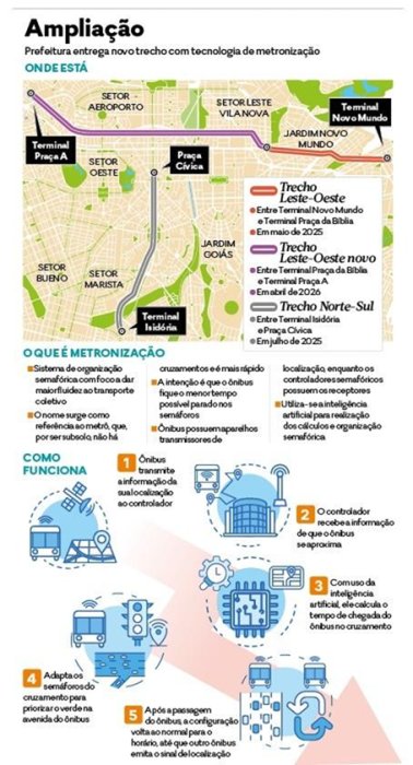 Quase um ano após a implantação do projeto de metronização dos corredores de BRT em Goiânia, em maio de 2025, o sistema atinge um total de 13 quilômetros (km), dentro dos 200 km de trajetos. Ontem, o prefeito Sandro Mabel (UB) entregou o terceiro trecho metronizado, que se refere a uma tecnologia de sincronização semafórica com os ônibus do sistema de transporte coletivo metropolitano, entre os terminais Praça da Bíblia e Praça A, pertencente ao BRT Leste-Oeste (Eixo Anhanguera). Em janeiro de 2025, o prefeito chegou a prometer que os corredores BRTs teriam todos os trechos implantados até meados deste ano.