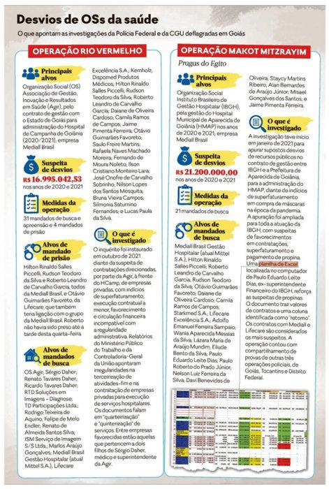 As duas operações, chamadas de Makot Mitzrayim (Pragas do Egito) e Rio Vermelho, têm alvos em comum (principalmente da Mediall) e apontam suspeitas de esquemas semelhantes relacionados a favorecimento em contratações, superfaturamento e serviços não executados. Os mandados foram cumpridos em São Paulo, Tocantins, Maranhão e Distrito Federal, além de Goiás.