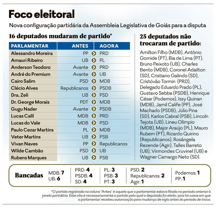 Com as mudanças de partidos, o MDB ficou com a maior bancada da Alego, com sete parlamentares. O UB aparece em seguida, com seis. O PRD, PSDB e SD têm 4 deputados, cada. O PL, PSB e PT têm bancada de três; PSD e Republicanos ficaram com dois; e Agir, Podemos e PP têm um deputado, cada.